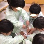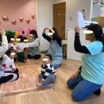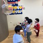 保育者による由来をパネルシアターで聞いた後には、事前に製作してあった豆入れを持って保育室に現れた大小の鬼さんを、豆に見立てた新聞紙で「鬼は外~!」と退治。