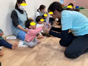 1歳児さんはバスケットコートでシャボン玉やボールを追って身体を動かしています。